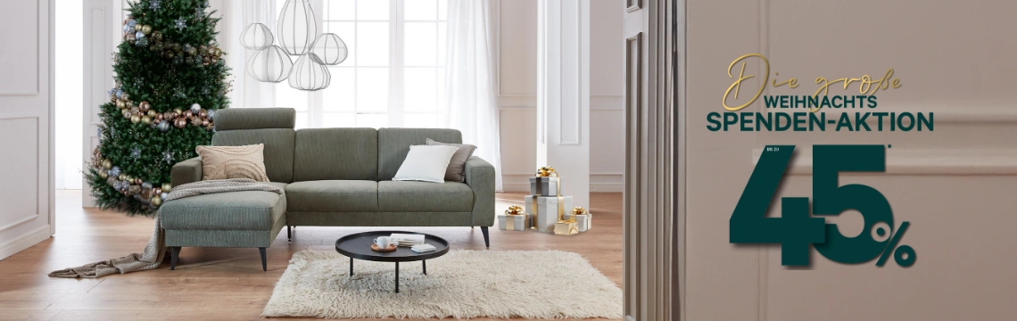 *Sie geben uns einen Betrag Ihrer Wahl, den wir zu 100% an den KINDERHILFE e.V. spenden werden. Dafür erhalten Sie 45% auf alle Neubestellungen von Sofas, Sesseln, Betten und die Kategorien Esstische, Bänke, Stühle, Couchtische, Beistelltische und Kastenmöbel. Ausgenommen sind Boutiqueware, Pflegemittel und bereits reduzierte Waren, z.B. Ausstellungsstücke, sowie Dauerniedrigpreise. Bei unseren angebotenen Produkten im Prospekt ist die Aktionsprämie bereits abgezogen. Nur gültig für Neuaufträge und nicht mit anderen Aktionen kombinierbar. Aktionsübergreifende Bedingungen: Die Aktions- und Prospektangebote sind exklusiv gültig für die Mitglieder unseres Kabs Family Clubs. Alle Rabatte sind nur bei Kaufvertragsabschluss verrechenbar und nur gültig bei Neuaufträgen. Alle Preise ohne Kissen, Dekoration usw. Alle Maße sind ca.-Maße. Als optional bezeichnete Erweiterungen der abgebildeten Artikel sowie andere Farben, Stoffe und ggf. Leder sind gegen Aufpreis erhältlich. Liefermöglichkeiten, Zwischenverkauf, Modellabweichungen und Irrtümer vorbehalten. Gültig bis siehe kabs.de oder solange der Vorrat reicht. Auf unserer Website sind Aktionsrabatte bei allen Preisen bereits abgezogen. ¹9,9%-Finanzierung mit einer Zahlungsaufzeit von 6 bis 60 Monaten möglich (keine Bearbeitungsgebühren, 9,9% Effektivzinssatz, 9,48% Sollzins bei 12 Monaten Laufzeit). Finanzierungsentscheidung obliegt unserem Finanzierungspartner: TARGOBANK AG, Kasernenstr. 10, 40213 Düsseldorf. Dienstleistungsaufschläge sind nicht rabattfähig. Nur in unseren Stores möglich. ²Sehen Sie die bei uns gekauften Möbel innerhalb von 14 Tagen anderswo bei gleichen Leistungen günstiger (Internetangebote ausgenommen), unterbieten wir das Angebot. ³Kostenlose Lieferung mit Aufbau und Altmöbelrücknahme ab einem Gesamtauftragswert von 2.500 Euro – ansonsten immer kostenfrei bis Bordsteinkante ab einem Gesamtauftragswert von 500 Euro. Bei einem Auftragswert unter 500 Euro fallen Lieferkosten an. Ausgenommen davon sind Ausstellungsstücke. Eine Entsorgung von Wasser- oder Gelbetten ist generell ausgeschlossen. Mehr Informationen finden Sie auf kabs.de. ⁴Bei Lagerware, so lange der Vorrat reicht. Alle Ausstellungsstücke sind sofort lieferbar. Alle Preise sind Abholpreise ohne Kissen, Dekoration usw. Liefermöglichkeiten, Zwischenverkauf, Modellabweichungen und Irrtümer vorbehalten. Lieferkonditionen für Ausstellungsstücke siehe kabs.de/lieferung. Aktion endet am 19.12.2025. Herausgeber: Kabs Digital GmbH | Gertrudenstr. 3 | 20095 Hamburg