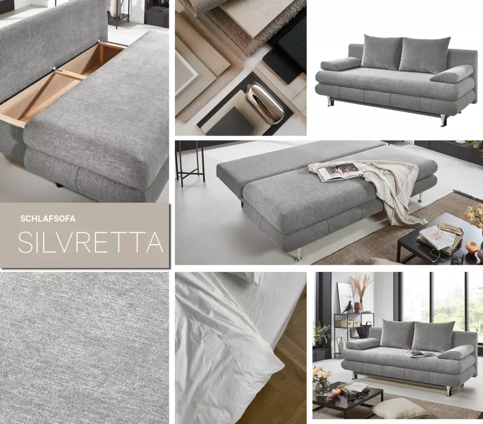 Das Schlafsofa Silvretta bringt klare Linien und wohnliche Gemütlichkeit zusammen. Der Stoffbezug wirkt ruhig und modern, die kegelförmigen Edelstahlfüße setzen einen eleganten Akzent.