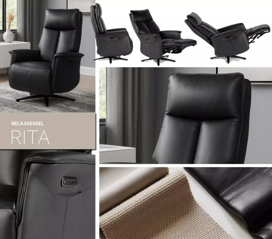 Der edle Lederbezug verleiht Rita eine hochwertige Ausstrahlung und sorgt für ein besonders angenehmes Sitzgefühl. So entsteht genau der Komfort, den man sich nach einem langen Tag wünscht, ob beim Lesen, Fernsehen oder einfach beim Zurücklehnen.