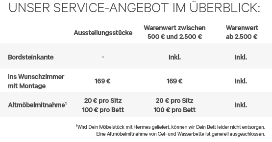 Ab einem Gesamtauftragswert von 2.500 € liefern wir es sogar direkt ins Wunschzimmer, inklusive Aufbau und Altmöbelrücknahme.