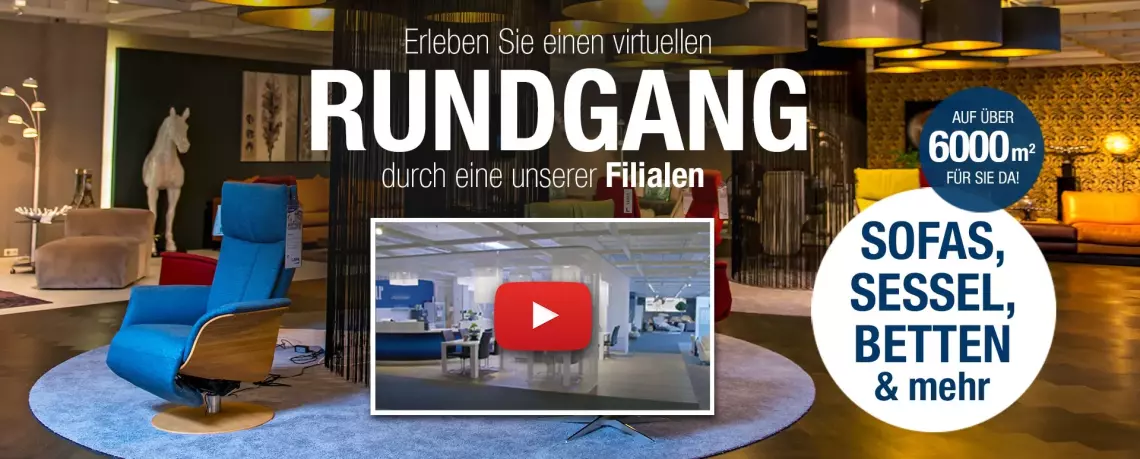 Erleben Sie einen schnellen Rundgang durch unsere Filiale in Bremen und lassen Sie sich von unserer Vielfalt an Sofas, Wohnlandschaften, Ecksofas, Couchtischen, Sesseln und Schlafcouches sowie Boxspringbetten, Betten und Matratzen inspirieren.